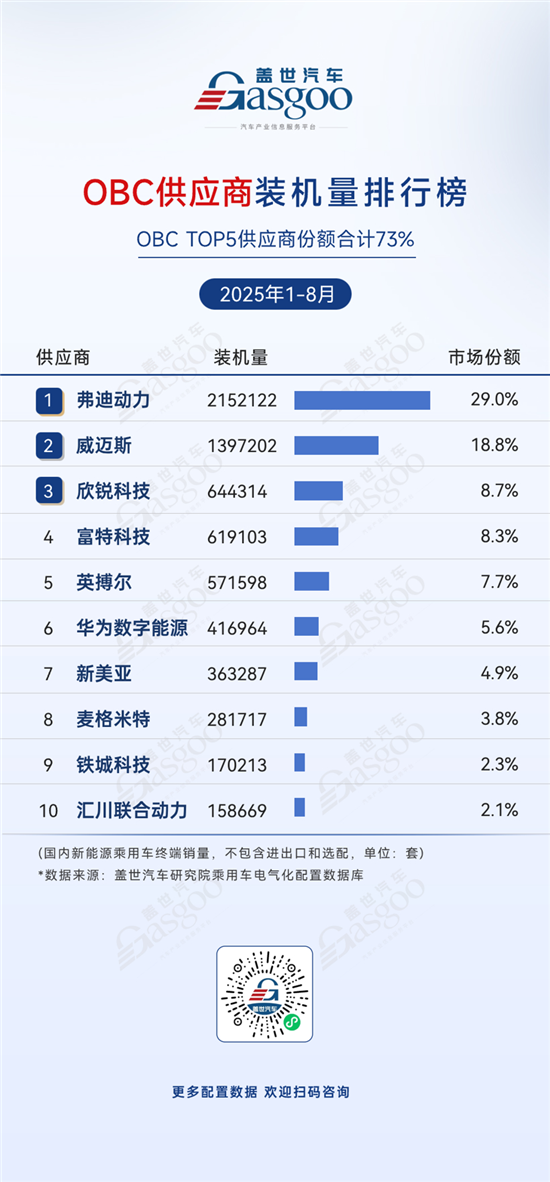 从OBC供应商装机量排行来看,弗迪动力以29%的市场份额、2,152,122 套装机量领跑,威迈斯以18.8%份额紧随其后,二者合计占据近半数市场;欣锐科技(8.7%)、富特科技(8.3%)、英搏尔(7.7%)位列第三至第五,TOP5供应商份额合计达73%,头部集中效应极为显著。华为数字能源、新美亚等企业市场份额在2.1—5.6%区间,行业呈现 “头部双雄主导、中腰部多元竞争” 的格局。