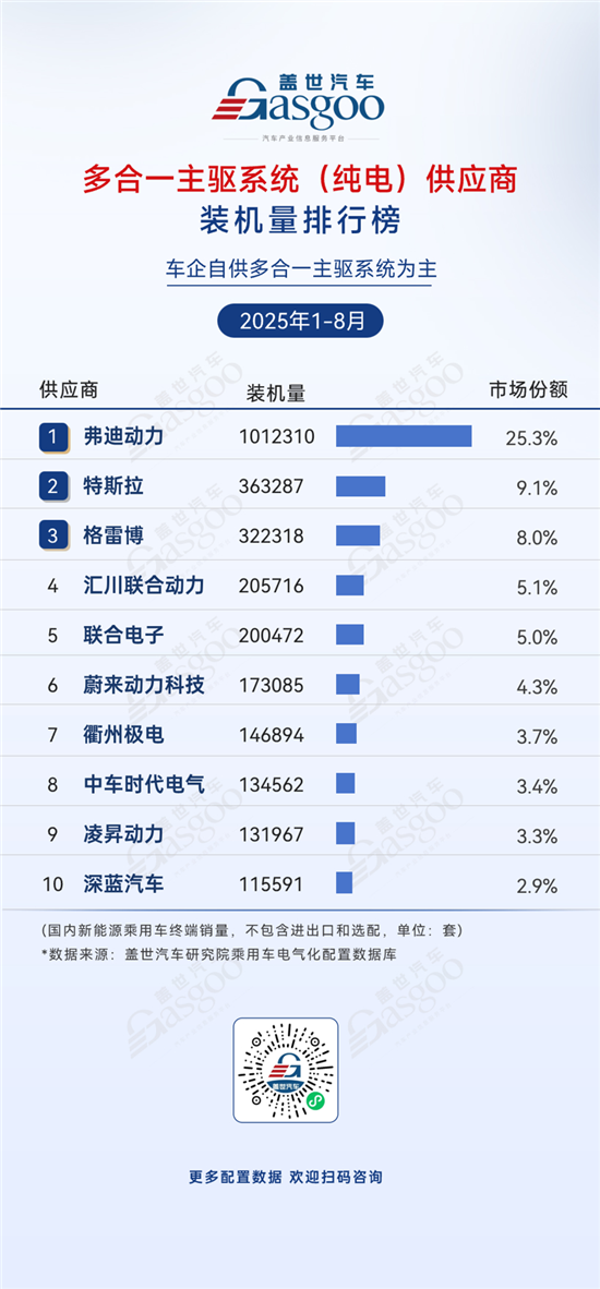 弗迪科技,2025年1-8月装机量2,021,764套,市场份额27.2%。