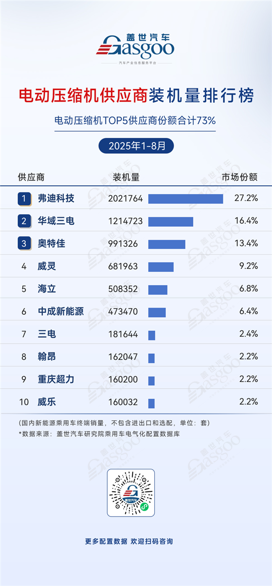 从电动压缩机供应商装机量排行榜来看,市场呈现头部集中的格局,TOP5供应商合计占据73%的市场份额。弗迪科技以 27.2%的市场份额、2,021,764套装机量领跑;华域三电(16.4%)、奥特佳(13.4%)紧随其后;威灵、海立、中成新能源等供应商均占据重要席位,而三电、翰昂、重庆超力、威乐等企业市场份额集中在2%-3%区间,行业呈现 “头部三强引领、中腰部多元竞合” 的格局,头部企业凭借规模效应与技术壁垒巩固优势,中腰部企业则需通过差异化竞争拓展生存空间。