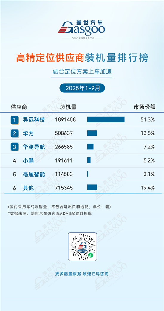 1-9月,高精定位市场呈现“头部引领、多强博弈”的格局。导远科技以51.3%的市场份额和近 190万套的装机量稳居榜首,凭借在融合定位领域的技术积淀与规模化交付优势,牢牢把控行业主导权;华为以13.8%的份额位居第二,彰显其在智能汽车技术生态中的深度渗透能力;华测导航、小鹏、毫厘智能分别以7.2%、5.2%、3.1%的份额参与市场竞争,体现出行业参与者在技术路线与场景布局上的多元探索。“其他” 供应商合计占比 19.4%,反映出市场仍有大量参与者在细分领域展开角逐。