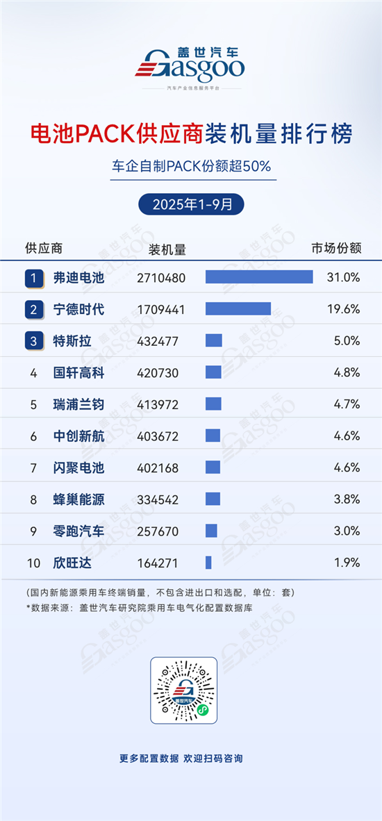 弗迪动力,2025年1-9月装机量2734299套,市场份额26.5%。