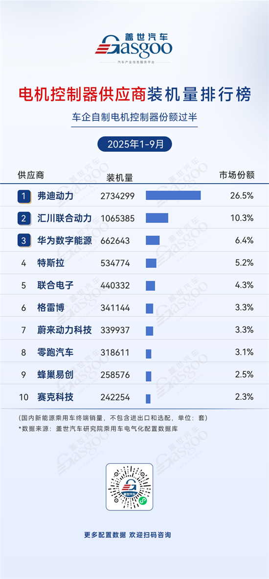 在电机控制器市场中,车企自制电机控制器份额已超半数,自主化趋势愈发显著。弗迪动力以2734299套装机量和26.5%市场份额稳居榜首;汇川联合动力(10.3%)、华为数字能源(6.4%)构成第二梯队,与头部的弗迪动力拉开差距;特斯拉(5.2%)、联合电子(4.3%)等企业分食剩余市场,格雷博、蔚来动力科技(均为3.3%)、零跑汽车(3.1%)等企业市场份额集中在 2.3%-3.3% 区间,竞争尤为激烈。值得关注的是,蔚来动力科技、零跑汽车等车企系供应商的上榜,体现出车企在电机控制器领域自主化布局的持续深入。