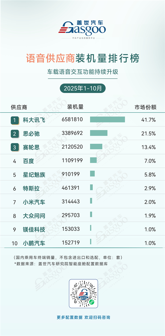 1-10月,车载语音交互功能持续升级,市场呈现国产主导的格局。科大讯飞以41.7%的市场份额和超658万套的装机量稳居第一,凭借技术积淀与生态整合能力构筑起显著的头部优势;思必驰与赛轮思紧随其后,分别位居第二、第三名,二者合计份额达34.9%,与科大讯飞共同包揽超76%的市场,形成核心竞争阵营。
