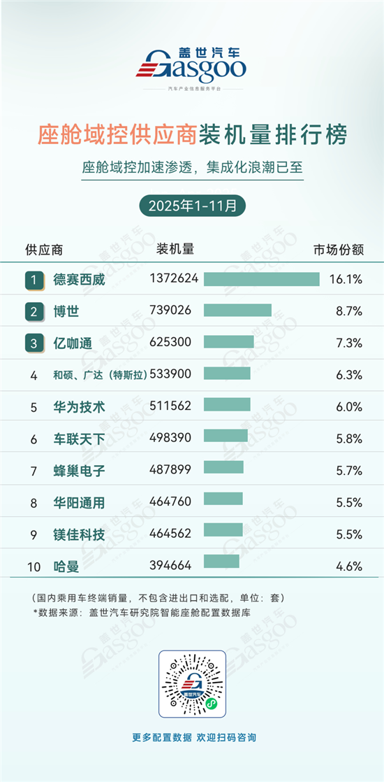 德赛西威,2025年1-11月装机量1372624套,市场份额16.1%。