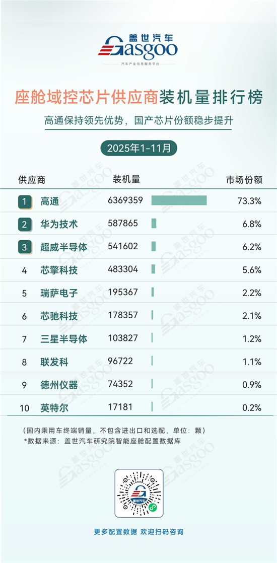 1-11月,座舱域控芯片市场延续 “头部高度集中、国产芯片份额稳步提升” 的格局,高通以73.3%的市场份额和超636万颗的装机量,持续占据绝对主导地位,其在车载域控芯片领域的技术成熟度与供应链规模优势依旧突出。与此同时,国产芯片阵营的成长势能进一步释放:华为技术以6.8%的份额稳居第二,芯擎科技、芯驰科技等本土企业也实现装机量与市场份额的双增长,充分体现出国内芯片厂商在车载域控芯片赛道的技术突破与商业化落地能力的提升。