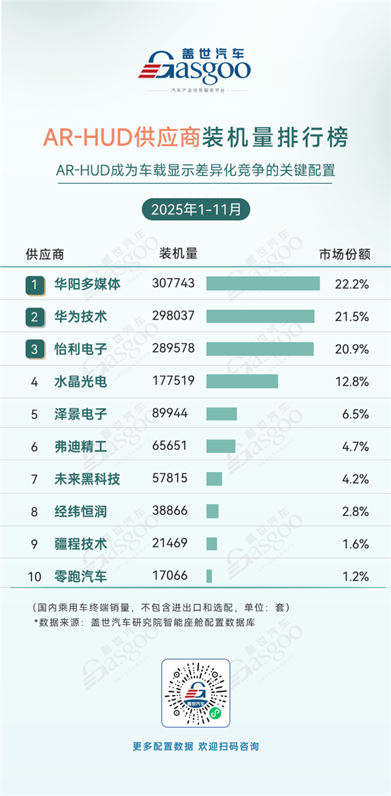 1-11月,国产供应商持续发力推动AR-HUD技术加速渗透,市场呈现 “头部高度集中、国产力量绝对主导” 的竞争格局。华阳多媒体以307743套装机量、22.2%的市场份额位居榜首,华为技术(21.5%)、怡利电子(20.9%)紧随其后,三者合计市场份额超64%,国产企业在技术量产落地与市场拓展上的优势进一步释放,成为驱动AR-HUD普及的核心动力。水晶光电以12.8%的份额位居第四;泽景电子、弗迪精工等企业聚焦细分场景与生态协同寻求突破,而零跑汽车作为整车企业的入局,也为AR-HUD赛道增添了新的参与维度,进一步丰富了市场竞争生态。