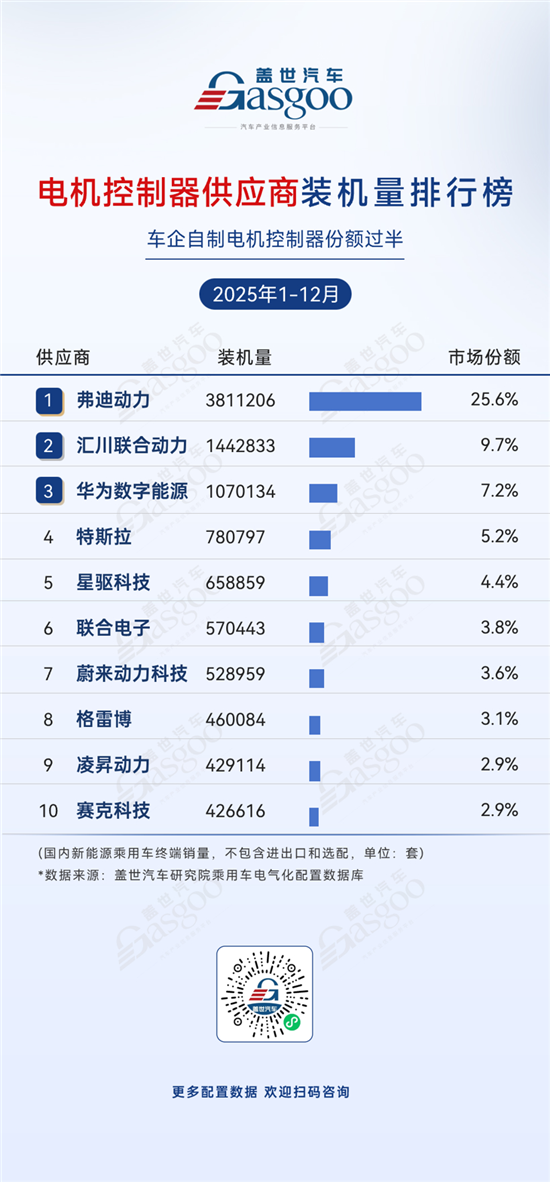 从2025年1–12月的电机控制器装机量数据来看,车企自制电机控制器装机量已占据较大比重,显示出整车厂在核心电控环节强化自主可控的趋势。在具体厂商表现上,弗迪动力以25.6%的市场份额稳居第一,全年装机量达3,811,206套。依托比亚迪在整车、电机及电控系统上的垂直整合布局,其电机控制器与自有车型平台高度匹配,在规模化应用与成本控制方面具备明显优势。汇川联合动力、华为数字能源等专业供应商位居第二梯队,展现出较强的第三方服务能力。与此同时,特斯拉、蔚来动力科技等车企自供体系亦跻身装机量前列,与专业供应商形成并行发展的市场结构,在不同技术路径和应用场景中展开差异化竞争,共同推动电机控制器技术持续迭代。