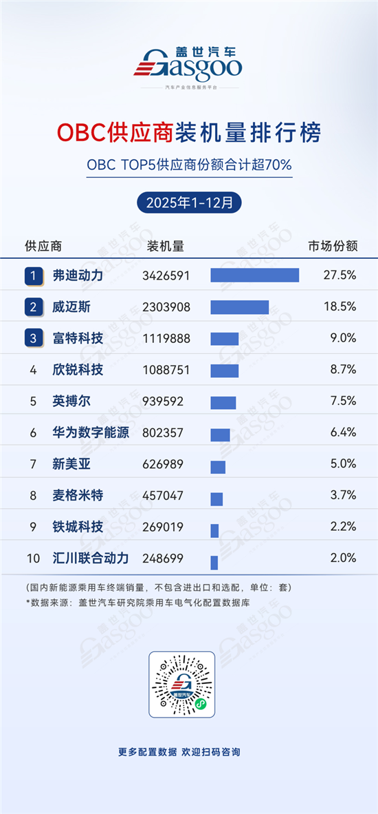从2025年1-12月的OBC装机量数据来看,国内市场呈现出头部高度集中、本土企业主导、技术分化明显的竞争格局。弗迪动力以27.5%的份额稳居第一,装机量达3,426,591套,这得益于比亚迪垂直整合的产业链优势,其OBC产品与自家车型深度适配,形成了高效的供应链闭环。威迈斯以18.5%的份额位居第二,凭借成熟的第三方解决方案成为多家主流车企的核心供应商。TOP5供应商合计份额超70%,反映出市场向头部企业加速集中的趋势。富特科技、欣锐科技等企业在细分领域稳步增长,印证了本土供应链在OBC领域的技术积累与产能优势。