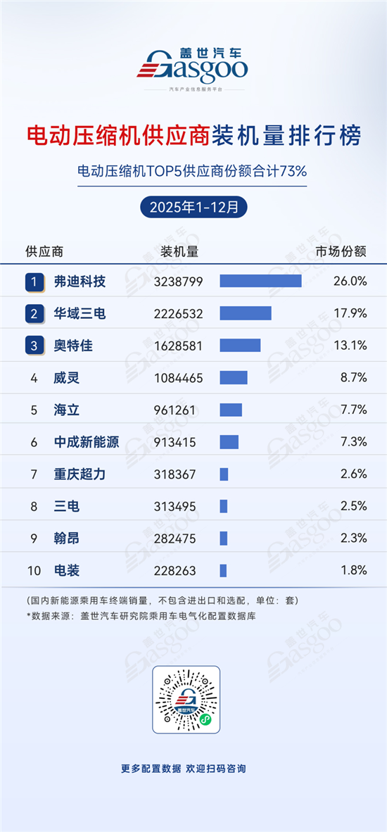 华域三电,2025年1-12月装机量2,226,532套,市场份额17.9%。