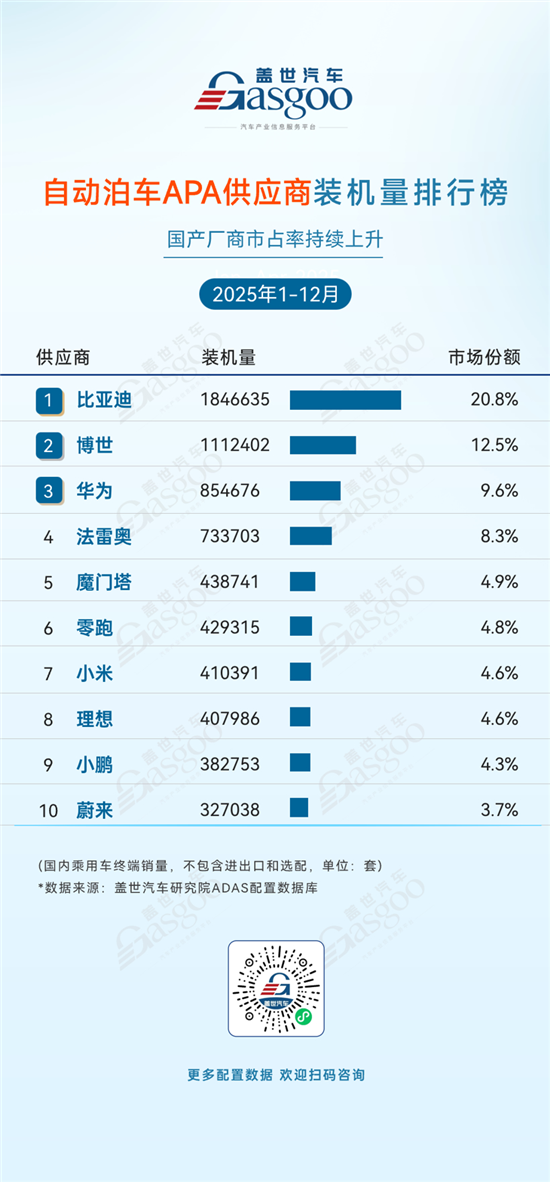 从2025年1-12月的自动泊车APA供应商格局来看,国内市场呈现出本土车企主导、国产厂商市占率持续上升的鲜明格局。比亚迪以20.8%的份额稳居第一,装机量达1,846,635套,其自研APA系统与自家车型深度适配,展现出垂直整合的强劲优势。博世、法雷奥等国际巨头凭借深厚的技术积累,仍占据重要市场份额。市场格局高度集中,TOP3供应商(比亚迪、博世、华为)合计占据超40%的市场份额,头部效应显著。整体而言,自动泊车APA市场的竞争已从单纯的功能实现转向场景覆盖、用户体验与算法迭代的综合较量,本土厂商的加速崛起,正推动国内智驾泊车产业在技术自主与生态构建上实现新突破。