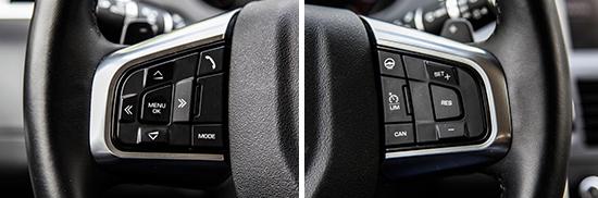 真皮多功能方向盘皮质手感柔软,握感出色,尺寸偏大也是SUV车型的特性。多功能按键分区明确,功能布局清晰,左侧为多媒体以及行车电脑控制,右侧为定速巡航。特别是方向盘加热功能,听着就“不明觉厉”,在冬季用车中开启方向盘加热那舒爽真是谁用谁知道。