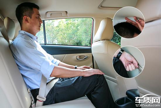 前排调整好座椅后体验者坐进后排,头部空间约有两指,腿部空间十分充裕约有一拳。对于这个尺寸的小型车而言表现已经算不错了。并且后排的地台为全平,坐下三名乘客脚部空间将不再局促。