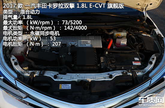卡罗拉双擎搭载了一台型号为8ZR-FXE的1.8L阿特金森循环发动机,其最大输出功率为73kW,峰值扭矩可以达到142N·m。这台阿特金森循环发动机采用电动水泵技术取代了传统的皮带,从而使发动机的运转效率更高,同时排放更低。与这台发动机配合的是一台可以输出53kW和207N·m的永磁同步电机,二者综合输出功率可达100kW。卡罗拉双擎的PCU(Power Control Unit,动力控制单元)应用了第四代普锐斯上的最新技术,重量级体积都有所减小。作为混合动力车型的核心部件,如今卡罗拉双擎所使用的PCU已经实现了国产,而与它一同摆脱进口标签的还有混合动力蓄电池与传动桥,这也是卡罗拉双擎能够在价格上有所突破的重要原因。值得一提的是,丰田为蓄电池提供了8年或20万公里的质保。
