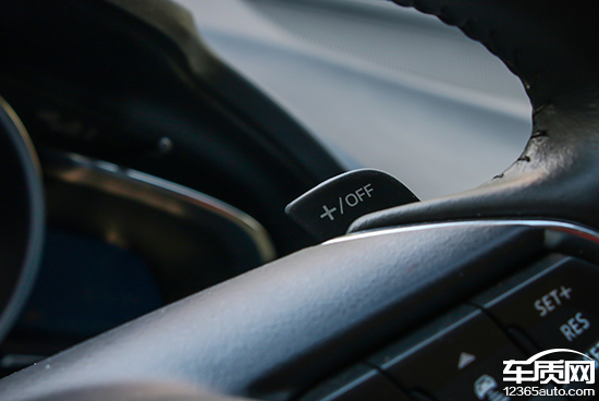 三辐式真皮方向盘并未采用平底造型,直径与圈辐粗细适中,且两侧带有明显的凹陷设计,与手掌的贴合度表现毋庸置疑,优于竞品同时也是注重操控的车型必备元素之一。两侧多功能按键包含了语音控制、蓝牙电话和定速巡航设定,便于日常操作之余,行车过程中也不易发生误碰现象。值得一提的是,该车背面还提供了换挡拨片,手感与换挡响应速度均值得肯定。