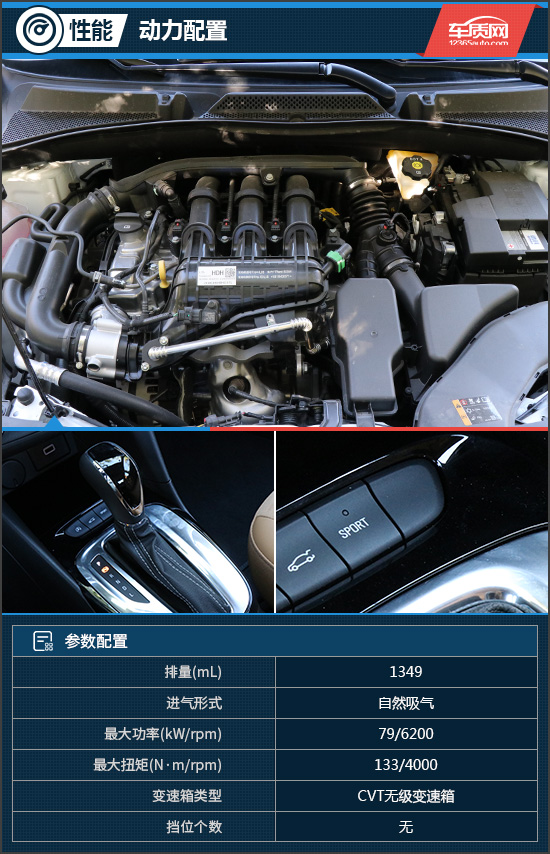 凯越搭载了通用汽车最新的1.3L Ecotec双喷射发动机,该发动机最大功率79kW,最大扭矩133N·m,与发动机匹配的为CVT无级变速箱,该变速箱具有紧凑、轻量以及更加宽泛的转速比,使得全新凯越的传动效率进一步得到提升,有着更好的燃油经济性。此外该发动机内采用了单缸双喷DPI、中置60°全程可变正时技术与高滚流气通道等技术,用以提高燃油效率。