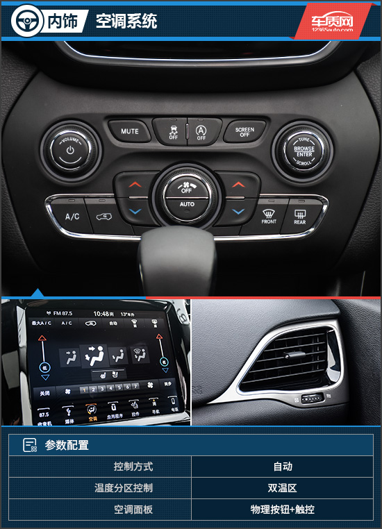 本次试驾的全新Jeep自由光为高配车型,搭配有自动空调,不过预计这项配置未来只会出现在中高配车型上,可能不会全系标配。空调控制共有两种方式,可以通过触控屏以及屏幕下方的按键操作,屏幕显示的信息更为丰富,各项调节都很直观,而按键则对于盲操作十分友好,两者搭配相得益彰,非常好用。