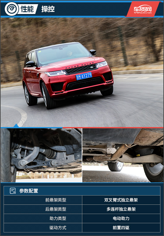 2019款路虎揽胜运动有3.0T和5.0T两款发动机可选,均为机械增压,其中3.0T发动机还分成了高低功率两个调校版本。试驾车型搭载的是低功率发动机,最大功率250千瓦,最大扭矩450牛·米。传动系统匹配的是8速手自一体变速箱,车型全系采用的都是前置四驱的驱动形式。