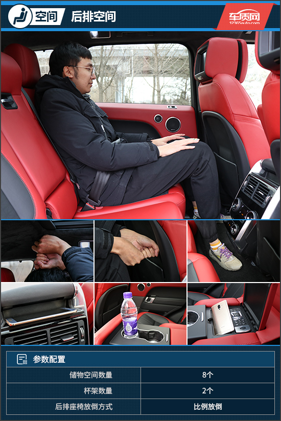 后排中央扶手设计有竖置的连体式杯架,后面还有一个带盖板的储物槽,空间利用比较高。除此以外,再算上门板储物槽以及前排座椅后侧的背袋,路虎揽胜运动的后排乘坐以及储物能力都十分强悍。