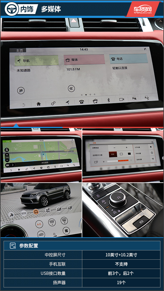 客观来说,路虎揽胜运动在内饰设计上并没有太多的亮点,基本还是遵循着典型的家族样式,不过中控部分的两块超大尺寸触控液晶屏还是有着极强的视觉冲击力,颇具科技感。这样的设计在此前的星脉上就已经见到过,未来也将会成为路虎车型的全新家族设计,无论是对于科技感的营造还是使用便利性层面都非常不错。系统流畅度顺滑,功能也比较齐全,只可惜试驾的HSE DYNAMIC版本并不支持手机互联,这项功能必须通过选装才能得到。