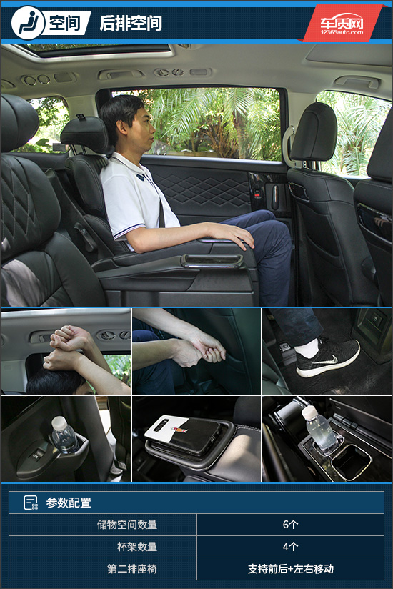 保持前排座椅位置不变,体验者来到第二排,坐好后头部和腿部空间均为两拳余量,中间地台全平没有凸起。此外,第二排座椅可以左右移动,将其分别移至到左右两侧,可以开启中间的折叠式杯架,而将两个座椅向中间靠拢,则能够获得更为宽裕的前后滑动空间,此时便可实现第二排座椅躺姿。储物方面,后排门板配备了单独杯架,独立座椅还配备了小尺寸置物板,方便放置手机。