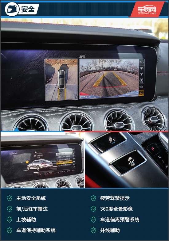 越是性能车,安全方面就显得尤为重要。这台AMG GT 50标配了主动安全系统、疲劳驾驶提示、前/后驻车雷达、上坡辅助等配置,还可选装360度全景影像、车道偏离预警系统、车道保持辅助以及并线辅助等。实际体验后,该车四周的摄像头非常清晰,夜间也能有不错的清晰度。