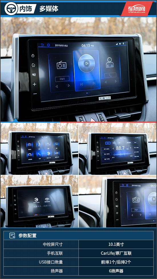 全新RAV4荣放升级了最新的10.1英寸悬浮式中控屏,尺寸以及屏幕分辨率表现都很出色。车载系统基于WINCE核心,界面清爽简洁,图标尺寸很大,明显是偏向实用性的设计考量。