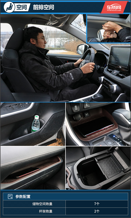 身高175cm的体验者坐进前排,头部余量达到两拳,乘坐空间十分充裕。储物方面,前车门板储物槽虽然尺寸略小,不过对于水瓶的适应性还算出色,不大的空间也进行了合理的划分。方向盘左侧以及副驾驶前端均设计有储物槽,后者表现尤为突出,空间非常大,随手放置手机和钱包等物品十分方便。中控台下方设计有储物槽,带有胶垫以及USB和12V电源接口。前排杯架采用贯通式设计,并且内部还配备了限位器。中央扶手箱内部空间规整,上部的盖板隔断方便放置一些票据和卡片等物品。