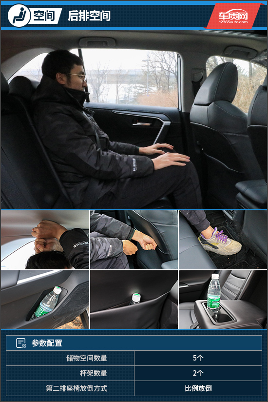 保持前排座椅位置不变,体验者来到第二排,坐好后头部空间两拳,腿部空间两拳有余,表现相当出色。储物方面,后车门底部的储物槽容积不大,基本上仅能容纳一个饮料瓶。前排座椅背袋尺寸很大,储物能力颇为强悍。扶手箱带有一个连体式杯架,不过这个杯架并未设计限位器,实用性相比前排表现略差。