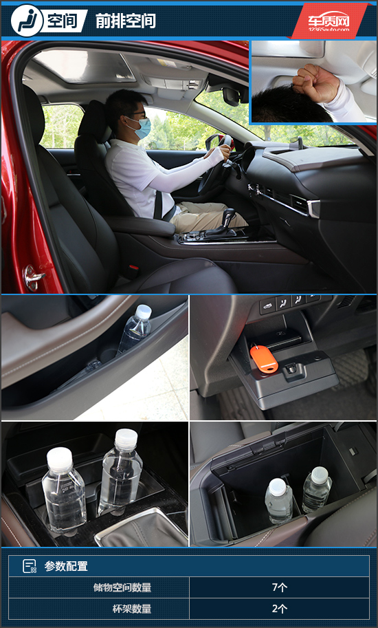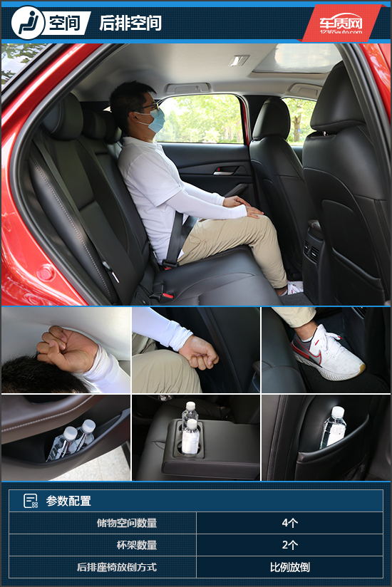 保持前排座椅位置不变,体验者来到后排,坐好后头部空间为一拳,腿部空间一拳稍多,表现中规中矩。此外,后排中间地台明显偏高,且长度和比较局促,舒适度一般。储物方面,后排空间也不如前排丰富,除了门板和副驾驶座椅靠背的储物袋,也就剩下后排中央扶手的杯架了,不过好在杯架采用贯通式设计,中间区域还能存放一些小件物品。