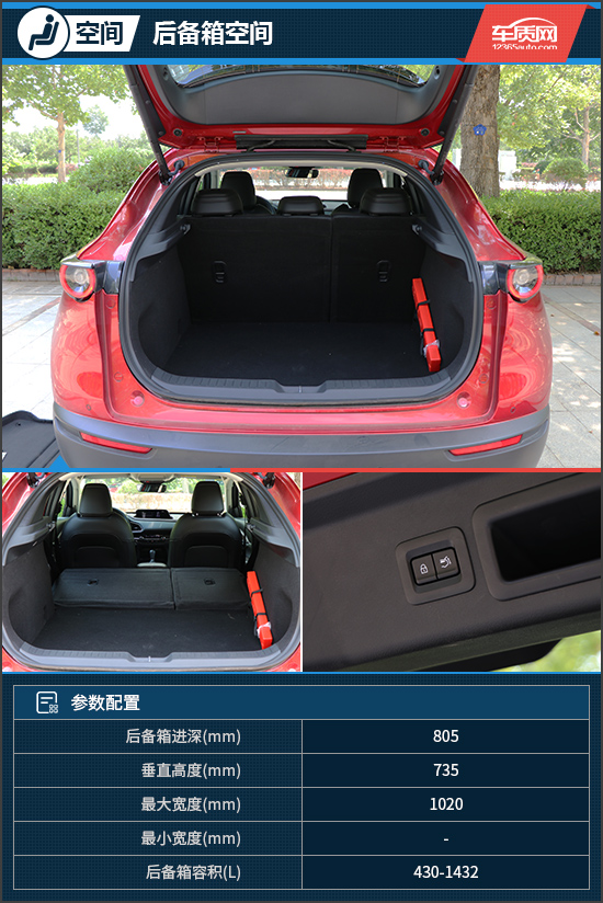 座椅采用真皮包裹,造型谈不上宽大,不过内部填充物较为柔软,且侧翼的包裹性也不错,乘坐感受还是相当舒适的。功能方面,顶配车型独享主驾驶座椅电动调节、腰部支撑以及座椅记忆,其余配置车型仅支持手动调节。全景天窗依然没有出现,新车仅配备了常规的普通天窗,不过对于本身尺寸不大的CX-30来说也基本够用了。值得肯定的是,CX-30全系均配备了四门车窗玻璃一键升降以及车窗防夹手功能,不论是便利性还是安全性都有所保障。