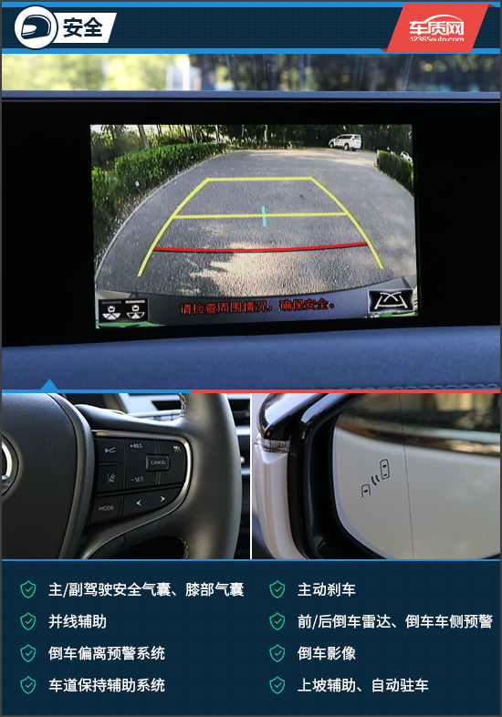 雷克萨斯UX 300e的被动安全配置十分齐全,例如主副驾驶安全气囊、前后排侧气囊/头部气囊、膝部气囊、前/后倒车雷达以及倒车影像等,非常厚道。除此之外,新车还配备了完善的主动安全系统,包括并线辅助、倒车偏离预警、车道保持辅助系统以及主动刹车,硬件配置层面,基本已经达到了目前行业的主流水平。
