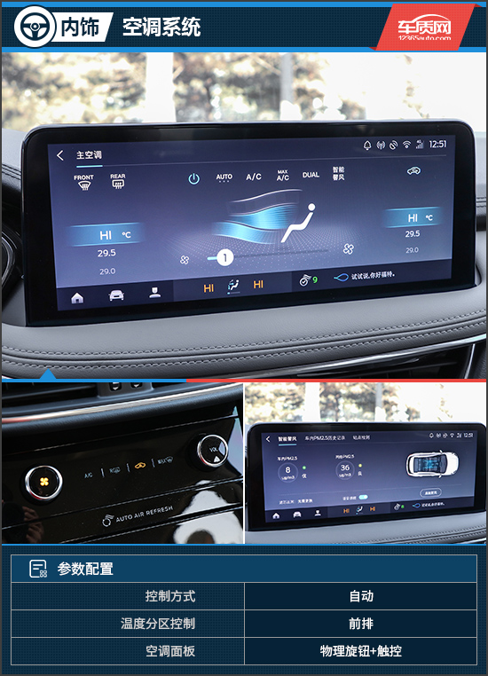 空调方面也是锐际的一处亮点,前排采用了触控+物理旋钮相结合的设计,其中上方触控屏显示效果直观,哪怕是新手也能很快地运用自如。同时,锐际还配备了AAR馨风系统,它能够根据AQS空气传感器,实时监测车内的空气质量,如果车内空气质量较差,车机语音会提醒驾驶者调节空调内外循环系统,从而保障车内空气质量。另外,锐际全系还标配了高效活性炭滤芯,它的过滤器可以有效隔离0.05um大小的颗粒。