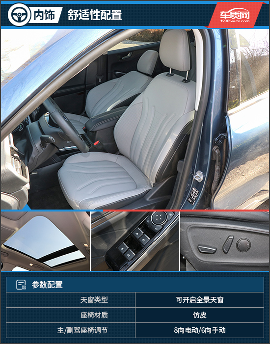 虽然锐际在舒适性配置方面表现中规中矩,但前排座椅的表现绝对能够令你满意,前排座椅采用仿皮材质,内部填充物厚实且柔软,同时主驾驶还支持8向电动调节,值得一提的是,坐垫前端向上翘起的角度较大,驾驶者刚坐进去时有一种“陷入”的感觉,这对于日常驾驶来讲非常舒适。