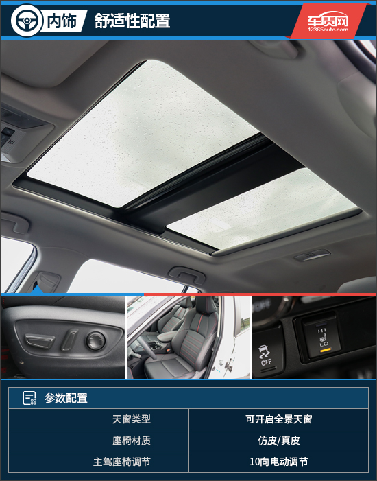舒适性配置方面,这台顶配威兰达高性能版可谓面面俱到,甚至还有意外惊喜。具体来看,新车顶部配有一个国内消费者喜闻乐见的可开启全景天窗,能够为后排乘客带来不错的开阳感。前排座椅采用仿皮和真皮两种材质搭配,加之内部填充物柔软以及10向电动调节,乘坐感受的确没得说,同时前排还配备了两档座椅加热配置,进一步提升舒适性。