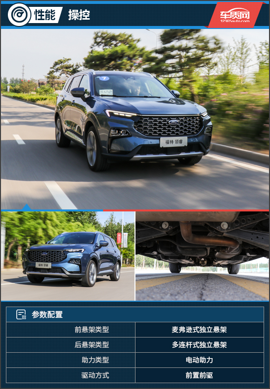 领睿配备了前麦弗逊、后多连杆独立悬架系统,悬架调教比较舒适,经过桥梁接缝以及减速带时可有效过滤多余震动。但是经过较大起伏的减速带时悬架表现还需提升,车内乘客可以感受到明显的跳动。另外需要说明的是,领睿全系并没有配备四驱系统,所以在非铺装路面上驾驶还需多加小心。
