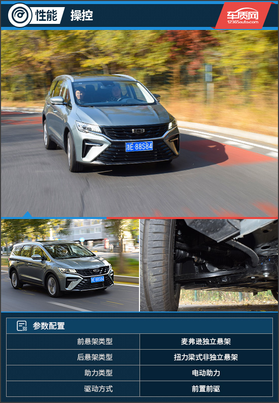 悬架整体依旧是偏向舒适的调校,对于路面上的细碎颠簸有着不错的过滤效果,日常道路行驶,路面的细碎振动基本可以被悬架以及嘉际L厚实柔软的座椅抚平,能为车内驾乘人员提供安稳的休息环境。不过要注意的是,在面对坑洼以及减速带等较大起伏路面的时候,嘉际L车身后部的抛跳感会比较明显,这也和后桥所采用的扭力梁悬架相关。