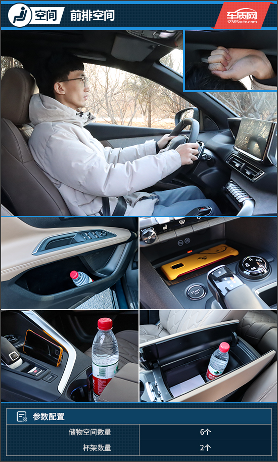 乘坐空间方面,身高178cm的体验者坐进前排,头部空间为一拳,得益于全景天窗带来的通透视野,因此乘坐空间感比较不错,并不会感觉压抑。前排门板储物槽空间较大,而且内部还进行了空间划分,利用率很高。中控区域,在挡杆前方及右侧均设计有储物槽,不仅拿取物品十分方便,而且前者还配有无线充电板,实用性表现令人满意。连体式杯架配有限位器,放置水瓶稳定性较好。中央扶手箱采用对开门设计,内部空间中规中矩,目测可以放下不少物品。