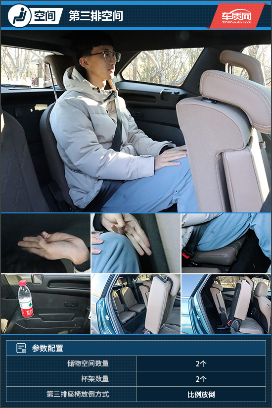 来到第三排,先说结论:空间表现尚可,虽然不算鸡肋,但是乘坐舒适性的确非常一般。将第二排座椅推至最前侧,仍能保持三指左右的余量,此时体验者坐进第三排,头部及腿部均有三指余量,对于一台中型SUV来说,这样的第三排乘坐空间表现已经算是不错。不过问题在于,第三排座椅的整体尺寸偏小,而且无论靠背还是坐垫都很薄,舒适性以及对于大腿的承托都十分糟糕,因此这个第三排用做应急短途使用尚可,除此之外确实就不能再奢求太多了。