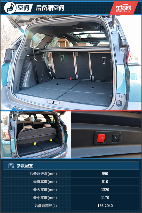 新款东风标致5008配备有电动后尾门,且带有感应开启功能。后备厢空间十分规整,比较遗憾的是作为一款SUV车型,其并未配备锚点。第三排座椅的开启和放倒都比较方便快捷,此外其还可以拆卸下来当成板凳使用,算是一个小亮点。第二排座椅同样支持比例放倒,第二、三排座椅全部放倒后,就能得到贯穿且纯平的储物空间,最大容积可达2040L,完全能够满足日常使用。当然,如果将三排座椅全部打开,那么后备厢容积就仅有可怜的166L,放置物品相当局促。对于一般家用场景来说,还是5座状态最为实用,保证乘坐舒适性的同时,后备厢容积也能够令人满意。