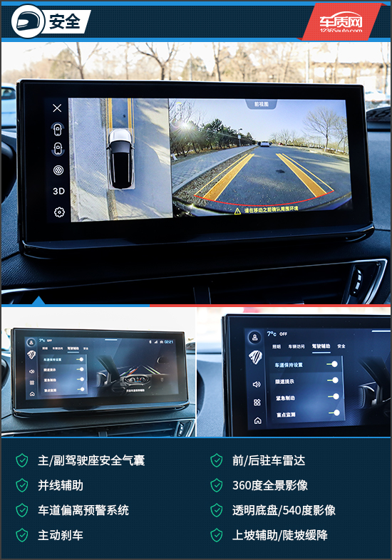 安全配置部分,这台顶配版本的新款东风标致5008整体表现出色,主/被动安全配置均较为丰富,而且使用感受也相当不错。全景影像画面清晰,畸变情况也并不明显,并且在影像画面的左侧还可以选择丰富的镜头角度。主动安全系统包括并线辅助、车道偏离预警系统、车道保持辅助系统、道路交通标识识别、主动刹车以及前防碰撞预警,算是非常迎合主流市场的配置表现。