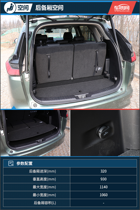 由于采用了2+3+2的7座座椅布局,所以后备厢空间难免会被侵占。三排座椅展开时,后备厢的进深并不大,储物能力比较一般,无法装载全车7个人的行李。而当放倒第三排座椅后,空间表现就与5座版几乎一致了,后备厢盖板还带有高/低两个档位可调,进而与第三排座椅靠背保持全平。此外,后备厢左侧还带有12V电源接口,能够为车载冰箱等电气设备供电。