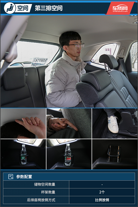 保持前排座椅不变,体验者来到第二排,头部空间仅为四指,腿部空间一拳。储物空间方面,储物槽数量、布局以及容积表现中规中矩,满足日常使用需求不成问题。