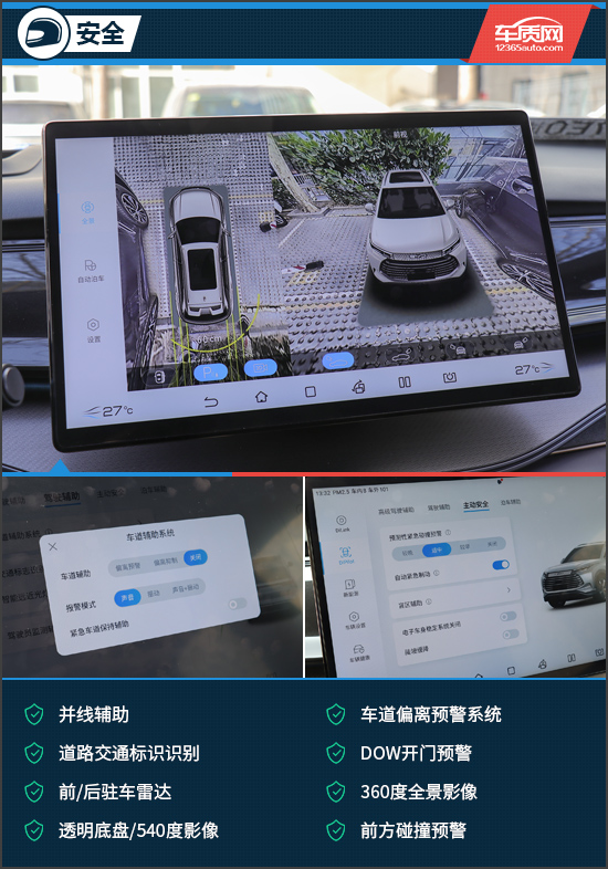 比亚迪一向在安全配置上十分厚道,护卫舰07也如此。新车不仅全系标配前/后驻车雷达、360度全景影像以及透明底盘/540度影像功能,除入门版车型外,其余车型还均提供并线辅助、车道偏离预警系统、道路交通标识识别以及前方碰撞预警等,配置表现非常出众。