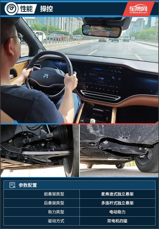 底盘方面,试驾车型采用了前麦弗逊后多连杆式独立悬架,并为四轮驱动。底盘整体调校还是更偏向运动的,在经过连续颠簸路面时,座舱内的舒适度一般,不过常见的细小震动它还是可以很好地过滤掉的。同时,新车在风噪和胎噪方面的把控很出色,实际体验中的静谧性值得表扬。