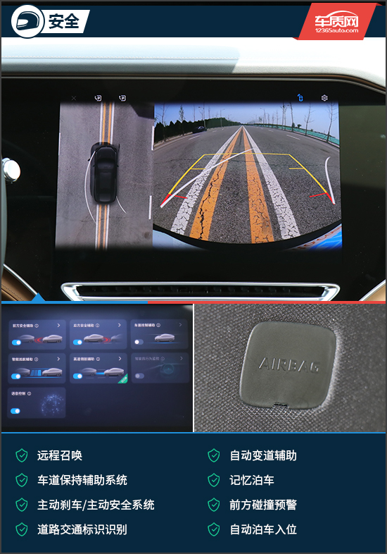在安全配置方面,试驾车型提供了非常丰富的主动安全以及辅助驾驶功能,例如自动变道辅助、主动刹车/主动安全系统、前方碰撞预警、远程召唤、自动泊车入位、360度全景影像、车道偏离预警系统、车道保持辅助系统以及AR-HUD抬头显示等,可以说是已经武装到了牙齿,这样的安全配置可以让驾乘者有着非常省心省力的用车体验。