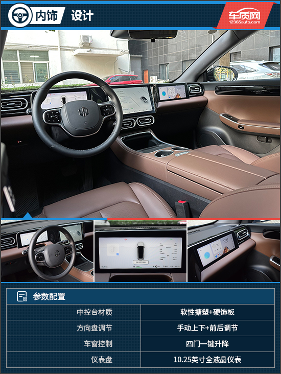 车内放眼望去,全是屏幕的新势力味道扑面而来。不过,并非简单粗暴地堆砌,试驾车型的屏幕布置还是讲究一定的设计,比如中控屏向外凸起,而两侧的仪表盘和副驾娱乐屏则向更远端布置,不仅中控屏更便于操作,而且三块屏不在同一平面的设计也不容易发生视觉混淆。在内衬用料部分,试驾车型整体让人满意,身体经常触及的地方,大部分都是软性材质,而且内饰配色沉稳不古板,能体现一定的档次感。