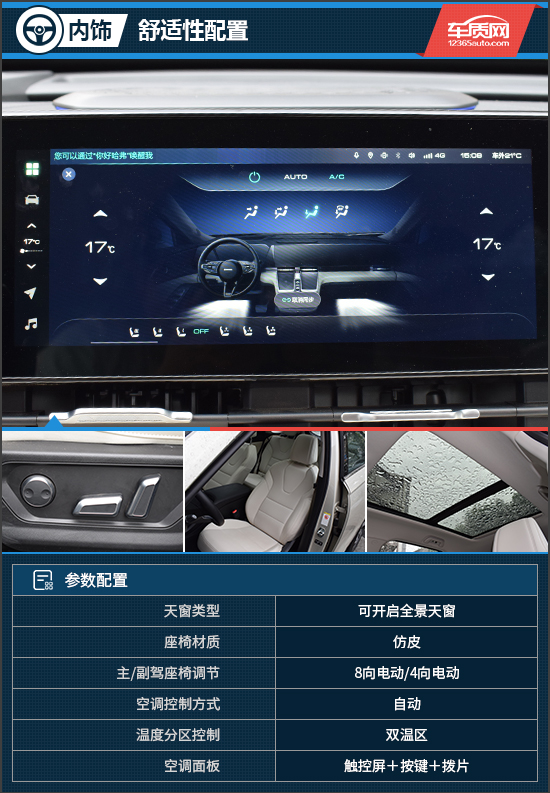 此次试驾的是顶配车型,包括主驾座椅腰部支撑、前排座椅加热等功能都有配备,再配合宽大柔软的座椅,驾乘舒适性让人满意。另外,试驾车型还配备超大尺寸的可开启全景天窗,车内开阳感足够,相当敞亮。