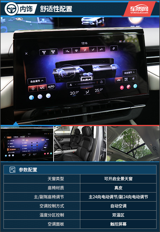 在舒适性配置方面,超大的可开启全景天窗增加了内部采光效果。试驾车型的真皮座椅不仅支持加热、通风、按摩功能,同时还支持24向调节,具有极高的舒适度;空调系统完全在11.1英寸屏幕内操作,操控时非常容易上手,同时该车还配有车载空气净化器、车内PM2.5过滤装置,保证了车内空气质量。另外,试驾车型还配有香氛系统,最多可支持3种香型。