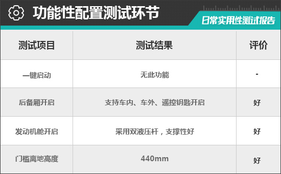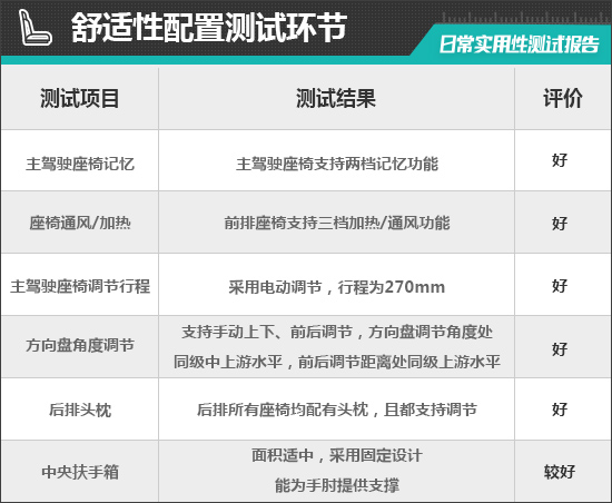对于车内使用空间的测试,只针对前排触手可及的空间,不包括手套箱、中央扶手箱等需开启的空间。测试方法是将以下固定物品全部放置在前排的各个储物空间内,通过固定物品的放置情况来判断车辆储物空间的表现。测试选定的固定物品为:2瓶常规大小的矿泉水、1部大屏手机、1支口红、1个挎包、1副墨镜、1把折叠雨伞以及1包常规尺寸的抽纸。