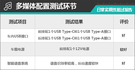 同时,我们对USB接口的电压与电流进行了测试,前排接口的电压电流为5.14V,2.03A。后排接口的电压电流为4.99V,1.96A。此外,该车前排还配有12V电源接口,位置位于前排扶手箱内部。